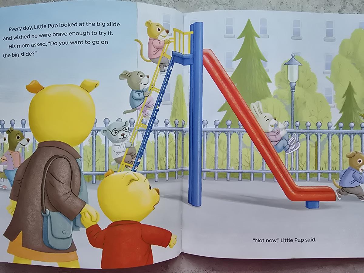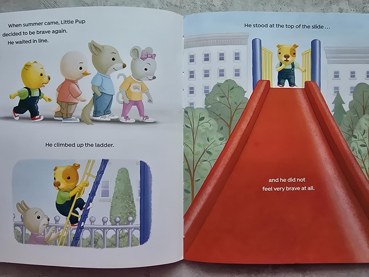 В этой милой истории о том, как противостоять страхам, Маленькому щенку приходится собрать все свое мужество и заручиться помощью друга, чтобы спуститься с детской горки. Маленький щенок уже не такой маленький, как раньше, и он с удовольствием покатается с большой горки на детской площадке. День за днем он наблюдает за этим, но, кажется, никак не может набраться храбрости. К счастью, он встречает человека, с которым находится в одной лодке - Маленького Утенка, и они оба придают друг другу храбрости, необходимой для того, чтобы подняться по лестнице и насладиться горкой! Детям будет интересно наблюдать за тем, как маленький щенок пытается обрести уверенность в себе, чтобы выйти из своей зоны комфорта и попробовать что-то новое.