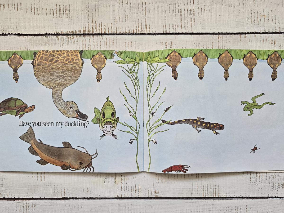 Детская книжка с картинками.... "Ты не видел моего утенка?" - спрашивает мама-утка. Сможешь ли ТЫ найти пропавшего утенка? Лауреат премии Колдекотта за иллюстрации. ЗЕЛЕНАЯ ЦАПЛЯ, УТКА-КРЯКВА, БОБР, ЧЕРЕПАХА, РАК, СОМ, САЛАМАНДРА... и многое другое!