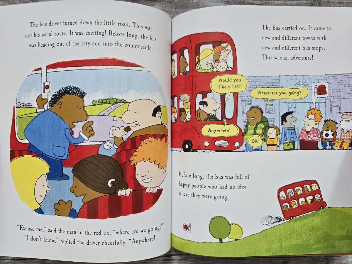 Каждый день водитель автобуса допивает чашку чая, надевает пиджак и отправляется в путь. Каждый день мужчина в большом красном галстуке выходит на кольцевой развязке, женщина с коляской – у библиотеки, а шумные дети – на Кловер Драйв. Но что, если однажды водитель свернёт на новую, захватывающую дорогу и подберёт новых, захватывающих людей? Так много людей, что автобус просто не вместится? Что ж, это единственное решение!