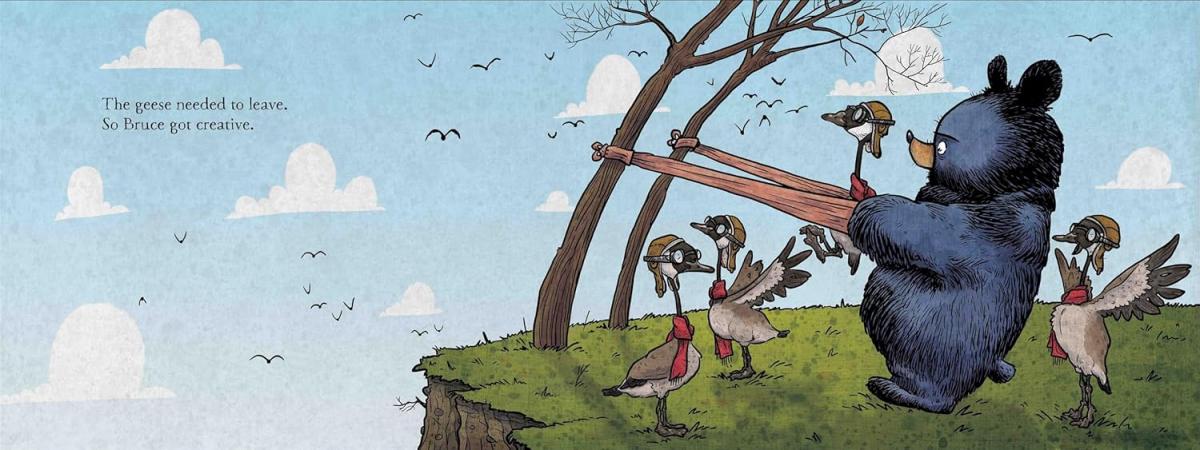 Медвежонок Брюс любит уединение. И еще он ест яйца. Но когда его сваренные вкрутую гусиные яйца оказываются настоящими, живыми гусятами, у него пропадает аппетит. И что еще хуже, гусята убеждены, что он их мать. Брюс пытается уговорить гусей лететь на юг, но, похоже, никак не может избавиться от своих новых спутников. Что же делать медведю?