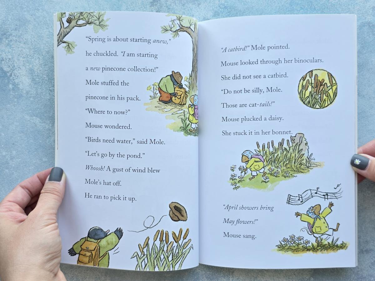 Книга памяти Теодора Сьюза Гейзеля. Ветреный весенний день, и Мышка и Крот в предвкушении. Они собираются наблюдать за птицами! Они планируют сделать книги о птицах! Мышка и Крот пакуют бумагу и мелки и спешат на улицу. Оказывается, за птицами не так-то просто наблюдать. Брызги в лужах их пугают. Наступание на хрустящие листья тоже.