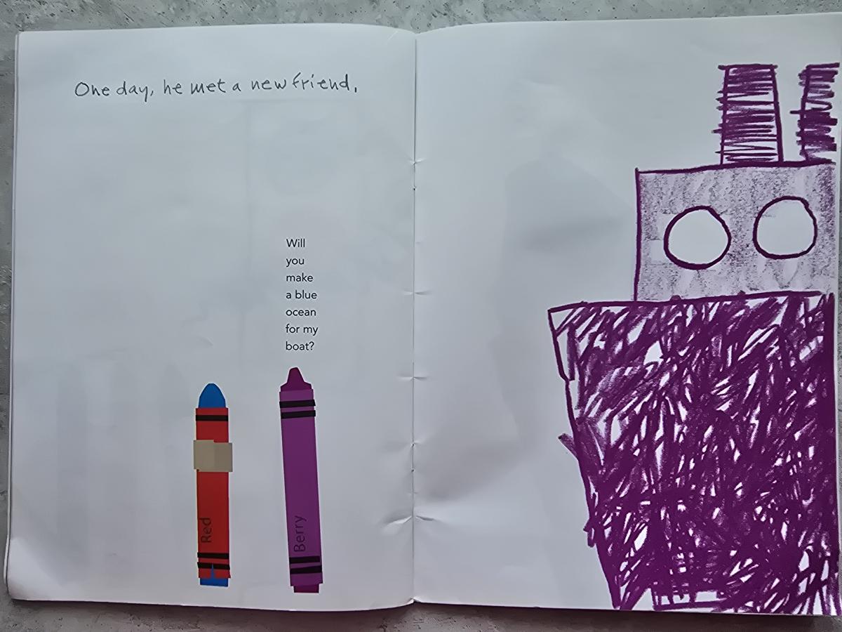 У красного ярко-красная этикетка, но на самом деле он синий. Его учительница пытается помочь ему стать красным (давайте нарисуем клубничку!), его мама пытается помочь ему стать красным, отправляя его поиграть с желтым одноклассником (пойди нарисуй красивый апельсин!), а ножницы пытаются помочь ему стать красным, обрезая этикетку, чтобы он есть где дышать. Но Рэд несчастен. Он просто не может быть таким.