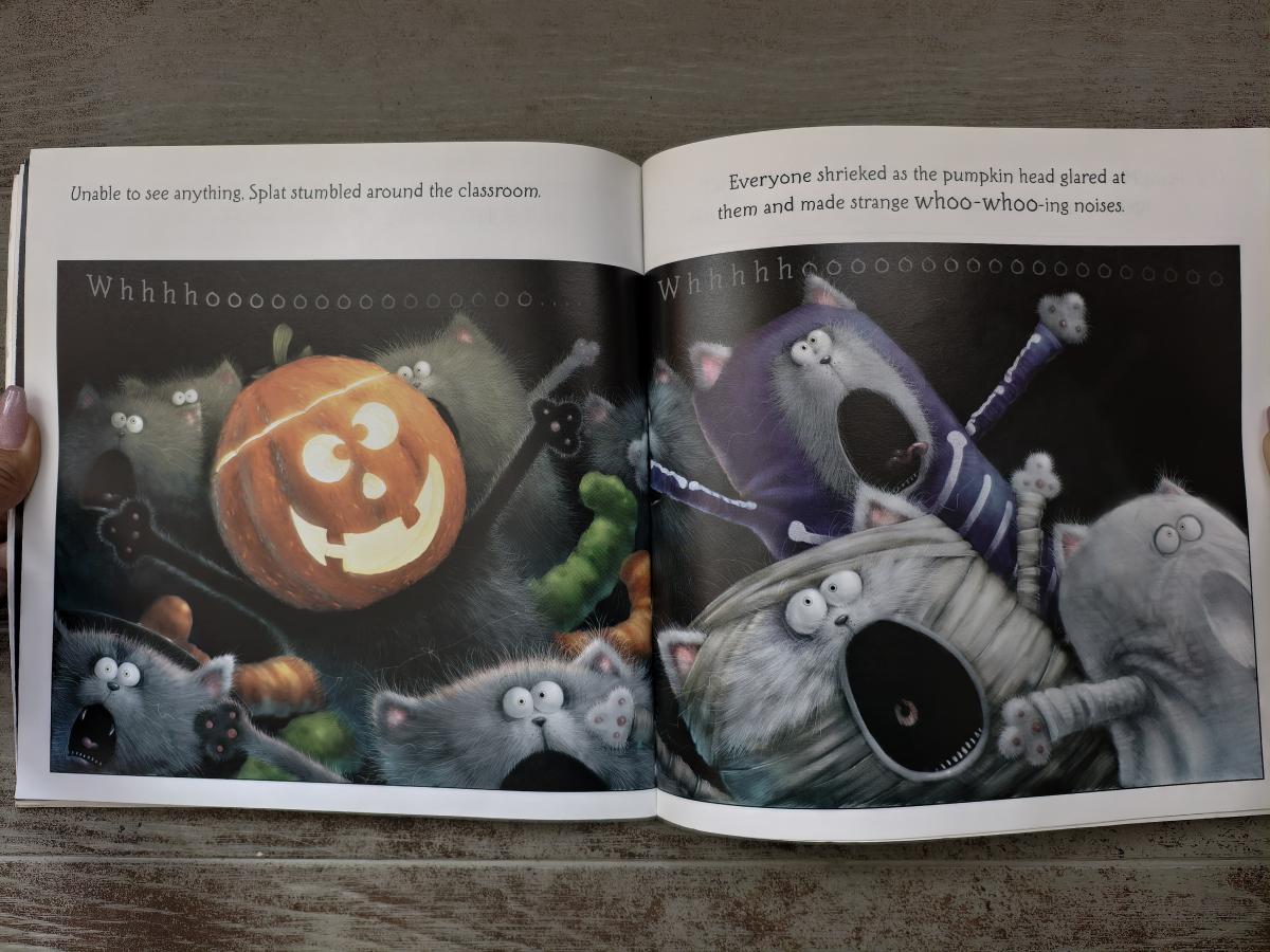 Сегодня Хэллоуин, и Сплат решил стать самым страшным котом в классе. К сожалению, он просто очень пугливый кот. Он боится маленького паучка, и все говорят, что его костюм выглядит скорее глупо, чем устрашающе. А когда миссис Уимпидимпл рассказывает в темноте историю о привидениях, Шлепок так пугается, что роняет свой тыквенный фонарь. Но когда свет снова включается, весь класс до смерти пугается маленького черного пушистого существа с большой тыквенной головой. Кто бы это мог быть?