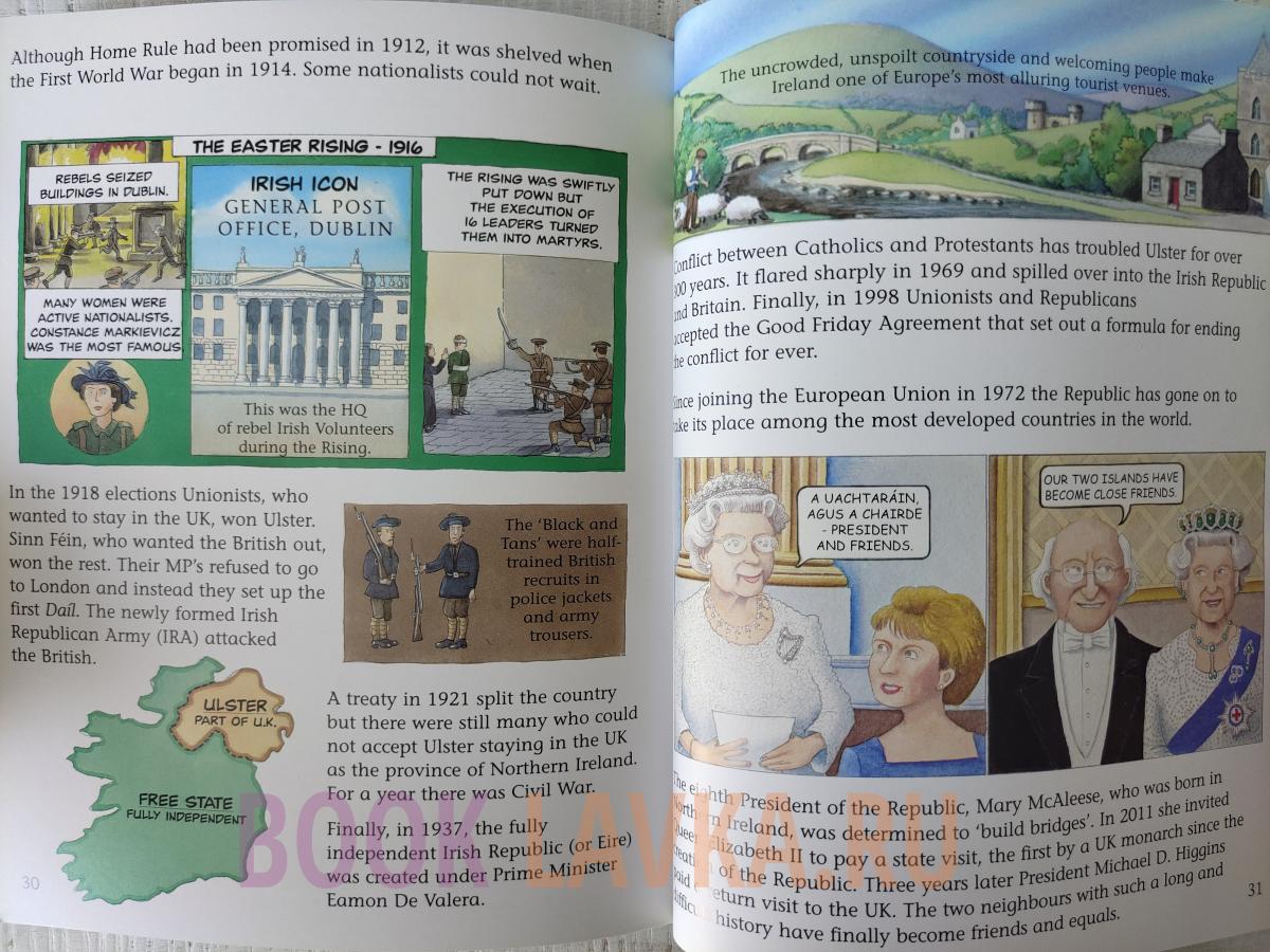 Комическое, красочное и лаконичное, с коротким текстом, множеством картинок и шутливых подписей, это блестящее введение в историю Ирландии. От его живописных карт на торцевой бумаге до панно "ирландских икон", начиная от Брайана Бору и заканчивая театром Аббатства, он полон полезной и увлекательной информации. История, которая часто бывает сложной и бурной, рассказывается с чувством и ясностью, от первых легенд до наших дней.