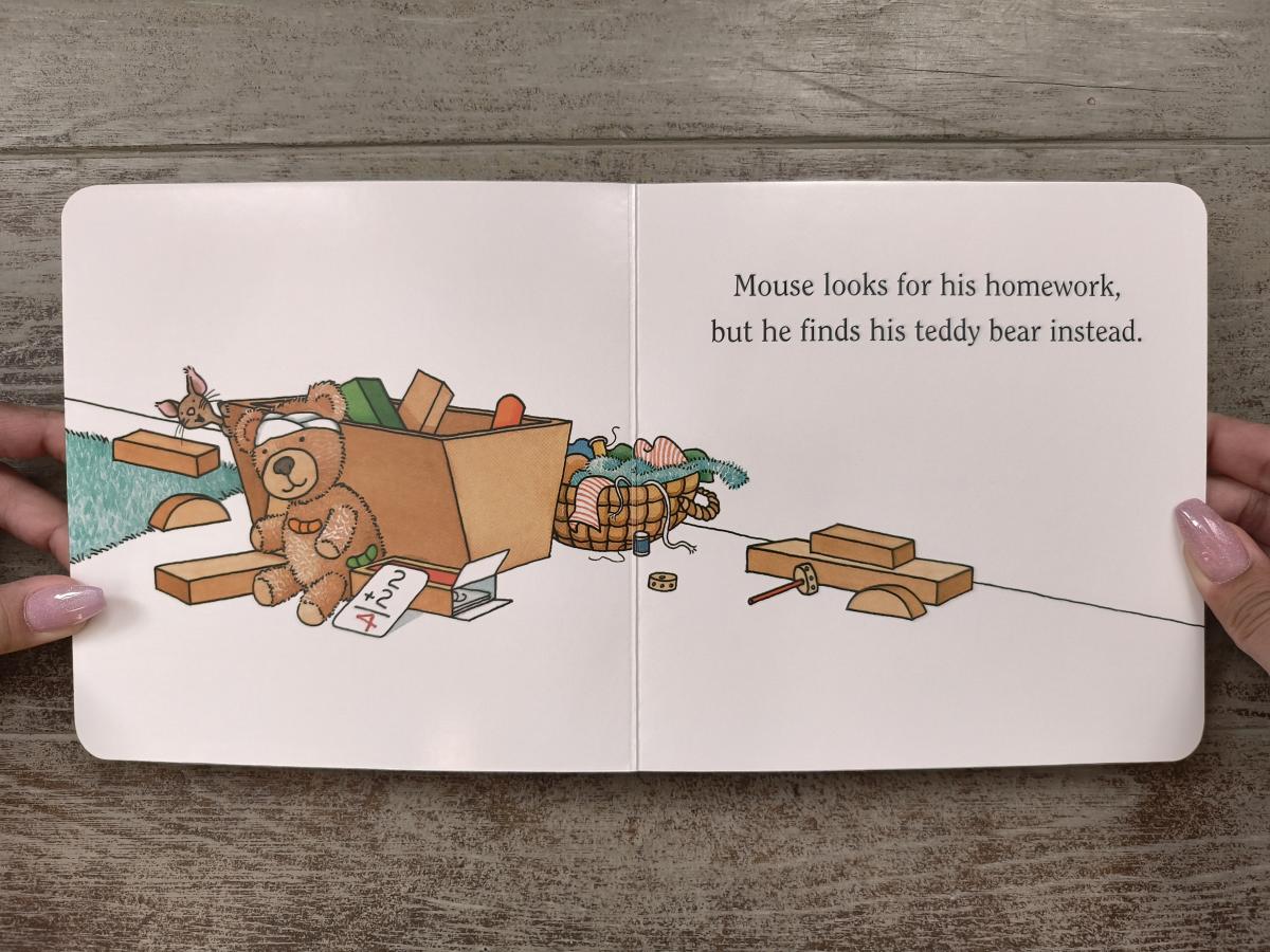 Мышонок собирается в школу, но... где же его домашнее задание? Вместо тетрадки он находит самые неожиданные вещи и устраивает настоящее приключение прямо у себя дома. Каждая страничка — это новая находка и улыбка!