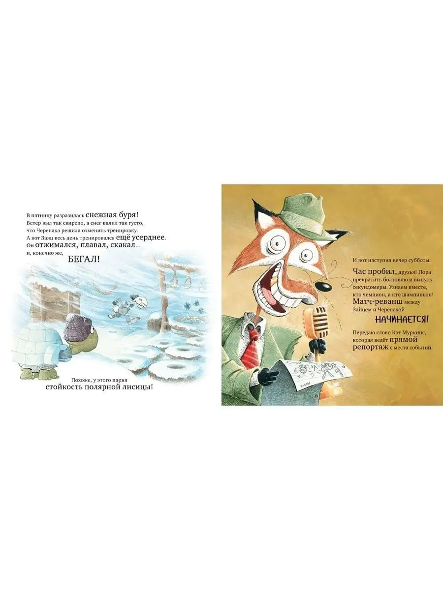 Книга "Черепаха и Заяц: матч-реванш!" - это увлекательная история в формате репортажа о тщательной подготовке к соревнованию, которое должно состояться между медлительной черепахой и спортивным зайцем.Вы с малышом станете свидетелем матча-реванша между чемпионом Черри "Шевелись Уже" Черепахой с фирменным стилем "Тише едешь, дальше будешь" и Гарри "Ураганом" Зайцем, которого отличает "Прыть и натиск". Целую неделю герои готовятся к битве, встречая массу препятствий на своем пути. И вот день X настает. Кто же станет победителем? И удастся ли Зайцу отобрать у Черепахи чемпионский титул? Об этом вы узнаете только в конце книги. А потом вместе с уставшим от такой нервотрепки, ведущим Джонни Лисом, отправитесь спать.