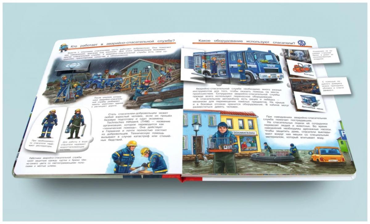 Книга о героях в повседневной жизни. Отличный подарок для детей, которые восхищаются пожарными и спасателями. Более 30 выдвижных элементов! Интересно и полезно! Подвижные элементы, которые можно отгибать, вращать, передвигать и т.д., помогут узнать новые слова и понятия, получить представление о том, как работают спасатели, а также развить мелкую моторику - при раскрывании/закрывании/выдвигании картинок. Более 30 выдвижных элементов!