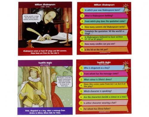 В наборе представлены 7 основных пьес Шекспира: Гамлет, Ромео и Джульетта, Макбет, Двенадцатая ночь, Буря, Юлий Цезарь, Сон в летнюю ночь + 1 карточка с изображением Уи́льяма Шекспира и справочной информацией о его творчестве.