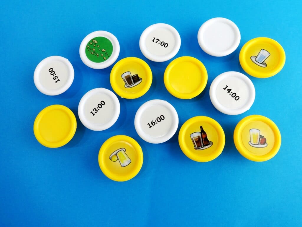 2) На белые подставки приклеиваем наклейки, которые указывают время и картинку с крошками. Одна белая подставка остается без наклейки.