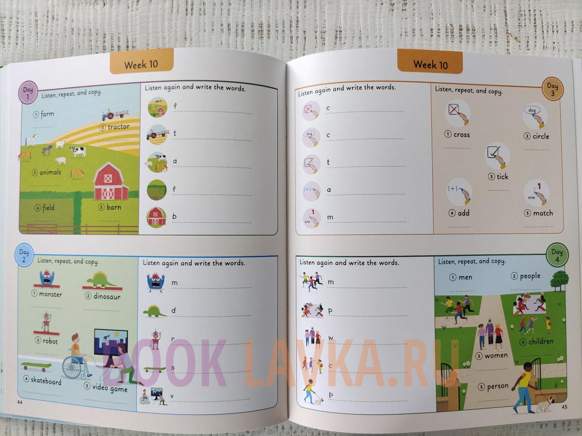Этот наглядный справочник, наполненный полезной повседневной лексикой, поразит воображение маленьких учащихся и привьет им любовь к изучению своих первых английских слов. В книге вашему ребенку предлагается выучить 5 новых слов и практиковать их каждый день в течение четырех дней, а затем на пятый день проверить эти слова с помощью различных интерактивных упражнений. В течение одного года ваш ребенок пополнит словарный запас более чем на 1000 английских слов.