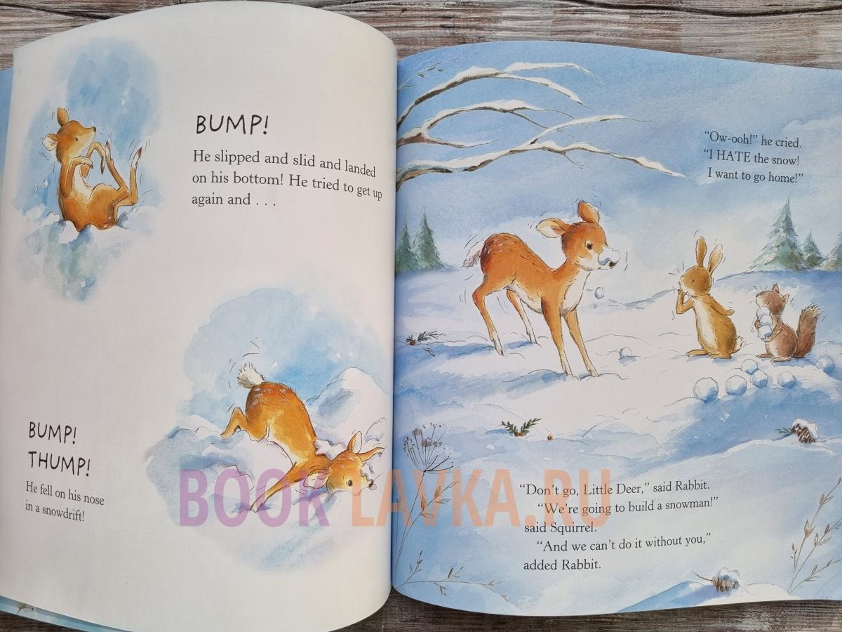 Когда однажды утром маленький олененок просыпается, все вокруг покрыто снегом. Он даже травинки не может найти, чтобы пощипать! Его друзьям, белке и кролику, не терпится выйти поиграть, но маленький олененок не уверен, что ему нравится странный, холодный и скользкий снег...
