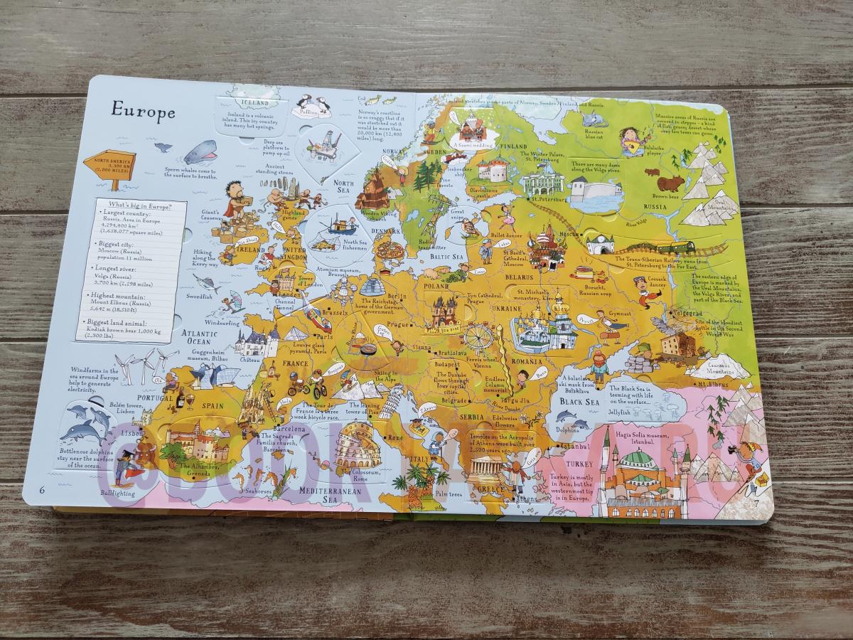 An atlas full of flaps to lift, revealing beautiful buildings, exotic animals and fabulous sights. Divided into the separate continents, each double page is crammed with information on sights and cultures to be seen all over the world as well as country borders and capital cities.