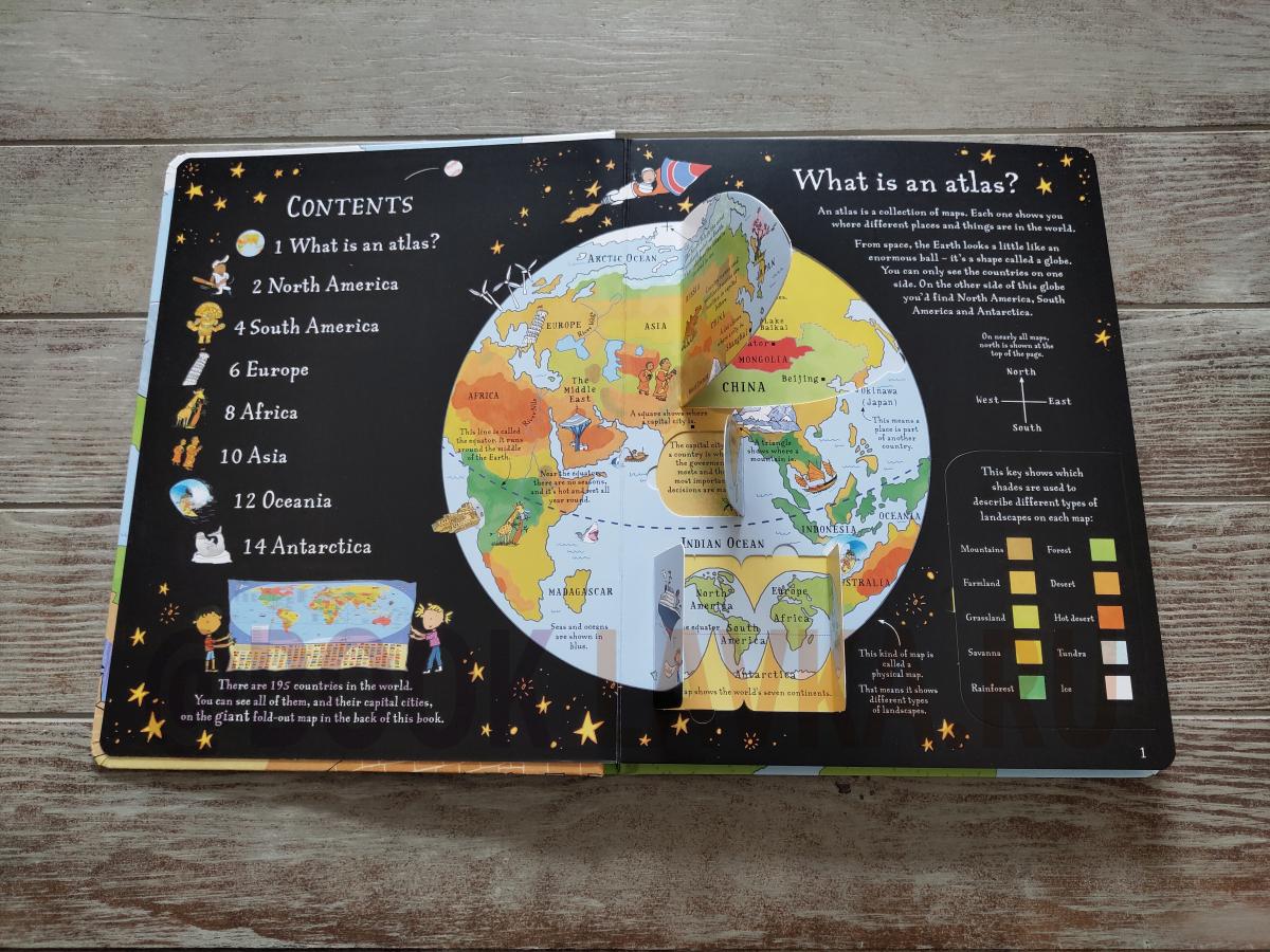 An atlas full of flaps to lift, revealing beautiful buildings, exotic animals and fabulous sights. Divided into the separate continents, each double page is crammed with information on sights and cultures to be seen all over the world as well as country borders and capital cities.