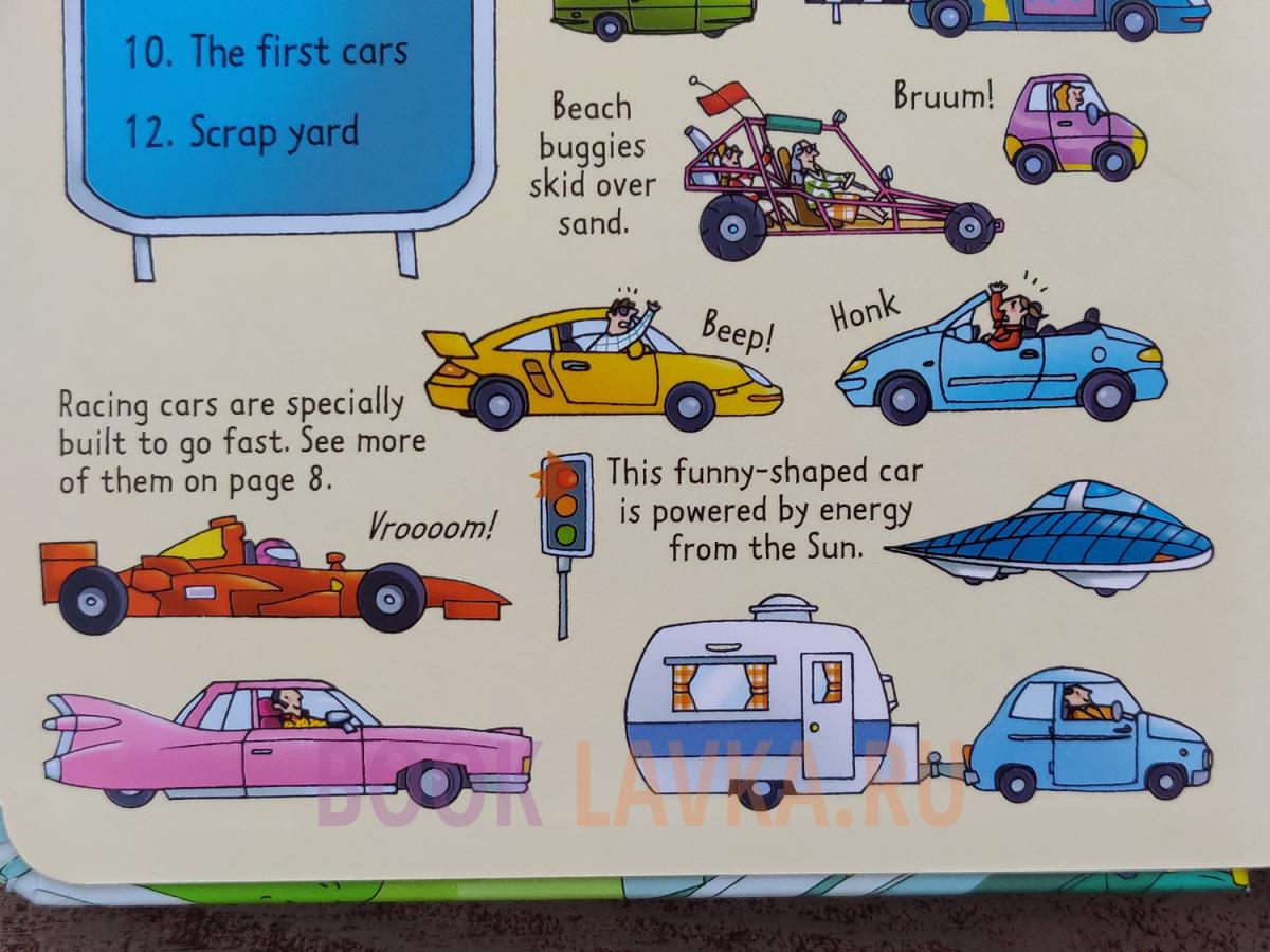 This is a fascinating flap book packed with interesting information about cars, from how the first automobiles were invented, to how speedy racing cars get around tracks. Each of the seven double-page spreads have several flaps to lift, many with double flaps, and several of them also have fun paper technology such as sliding a race car or moving a car along a production line in a factory. Other spreads look inside a busy car repair shop, and a scrap yard where old cars get crushed.