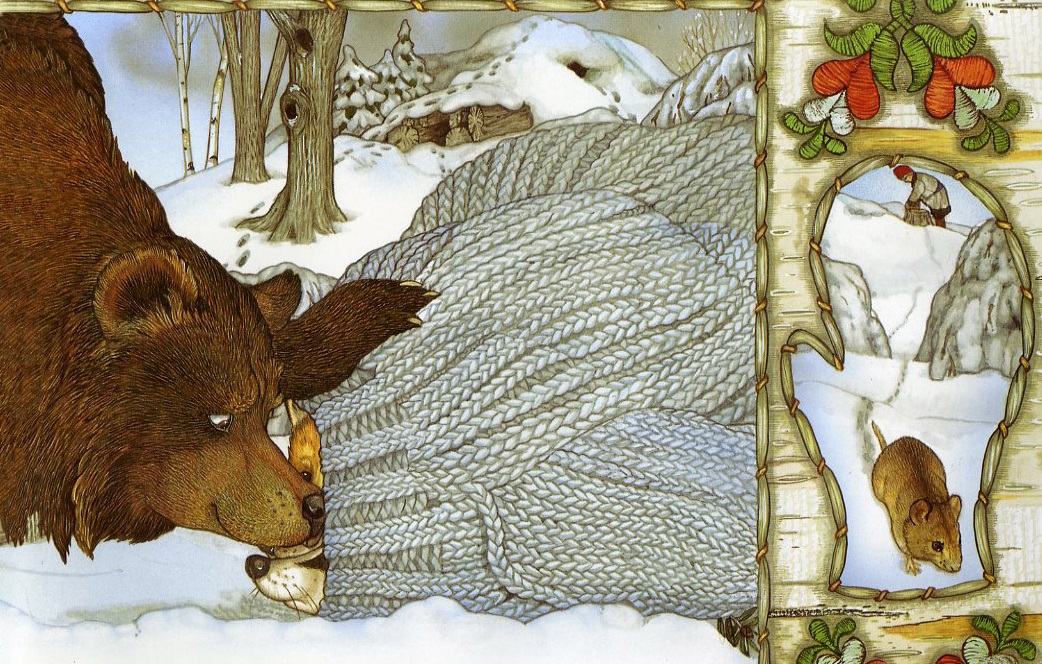 As the story of the animals in the mitten unfolds, the reader can see Nicki in the borders of each page, walking through the woods unaware of what is going on.