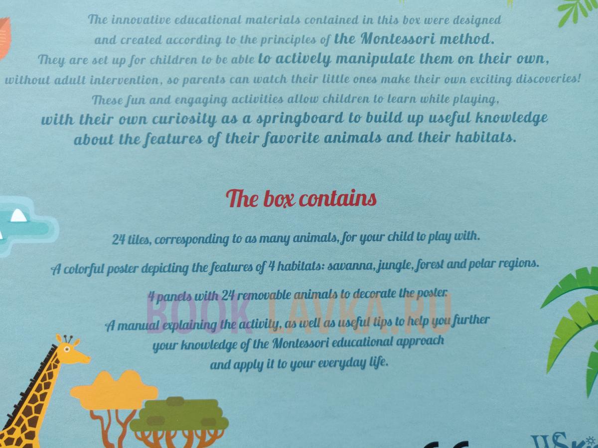The world of nature comes into little explorers' homes. Thanks to the tiles with the illustrations of 24 animals of the savannah, the jungle, the wood, and polar regions, together with a brightly coloured poster, children between 4 and 6 years begin to build their knowledge of the animal world. By means of various Montessori activities, little children learn the features of their favourite animals and their habitats autonomously and by visual learning strategies. The structure of the activities suggested in the texts develops around some fundamental Montessori principles: - the content of the games follows a progressive complexity, to allow the child to become gradually familiar with it; - each activity has 3 progressive stages of learning: 1. presentation of the material through senses, 2. Recognition of the learning object material, 3. re-enactment of the material; - in each activity the child can directly control his mistakes, so that he can realize by himself the accuracy of his work; - the adult has a role of assistance and introduction to the various activities but the child can play independently the games; - handling and practical experience have a central role: often is required you to glue stickers, cut, draw and finger paint.