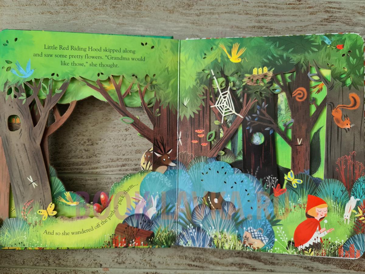 Journey into the woods with Little Red Riding Hood, peeping through the trees, lifting flaps to see what's beneath things, and watching granny's cottage emerge with each turn of the page. Delicate cutaways and holes to peep through are layered on top of each other to create a magical filigree