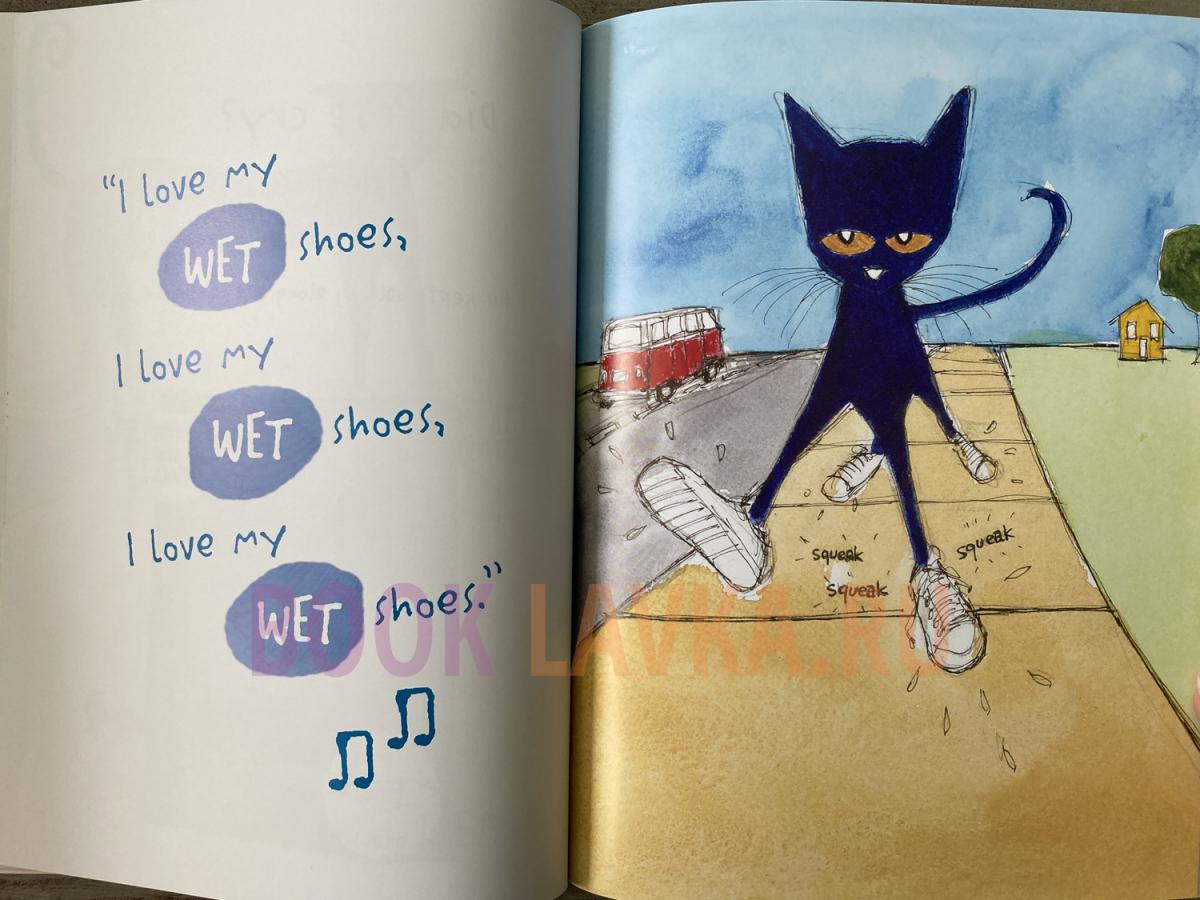 Кот Пит идет по улице в своих новеньких белых кедах. По пути его обувь меняется с белой на красную, синюю, коричневую и МОКРУЮ, когда он ступает по кучам клубники, черники и других больших беспорядков!