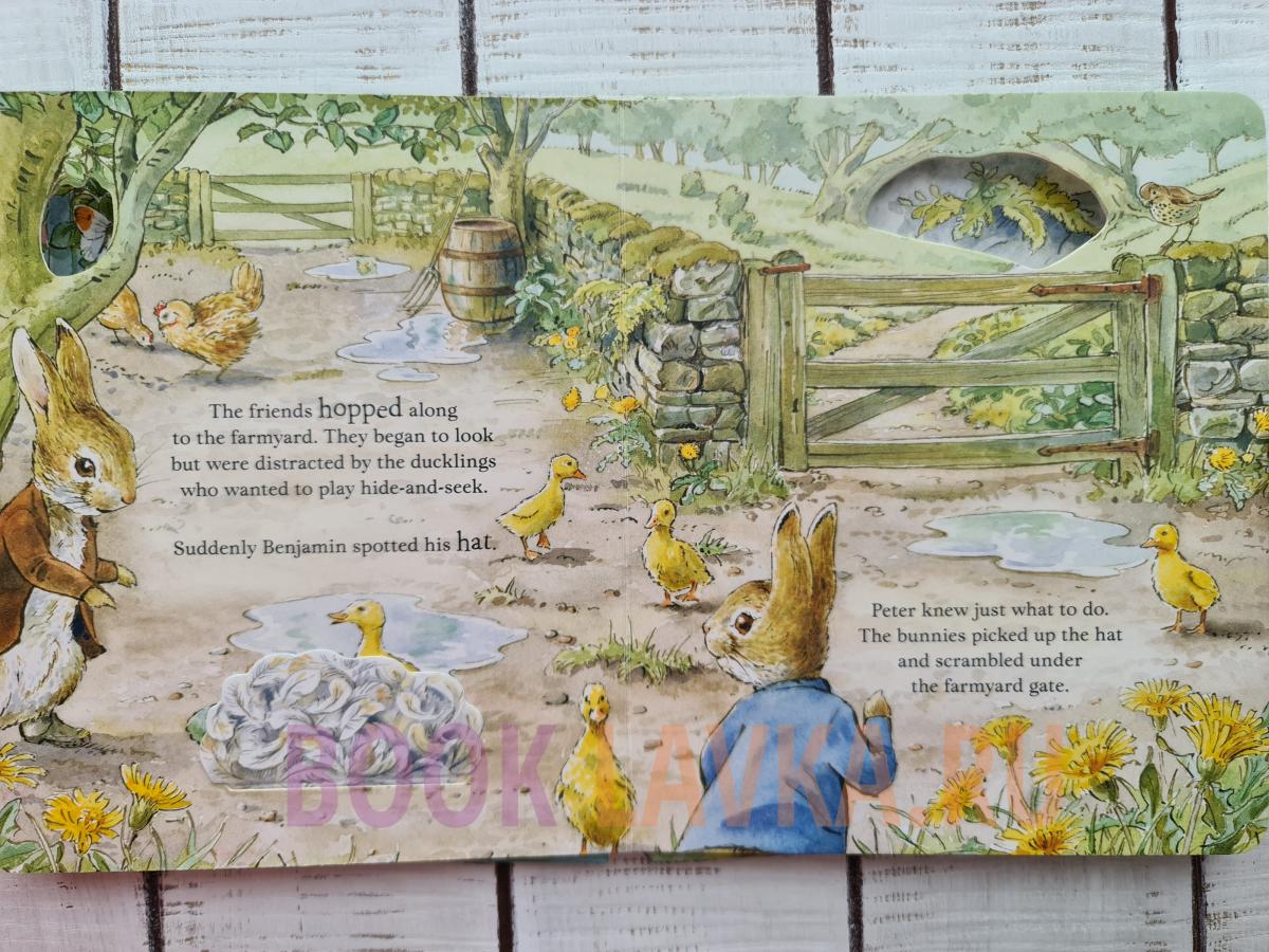 Peter Rabbit and Benjamin Bunny are having a lovely time at the pond when they realise Benjamin has lost his favourite hat! Can the two bunnies find the hat in time to get home for tea? Follow Peter and Benjamin through this story with flaps to lifts and holes to peep through.