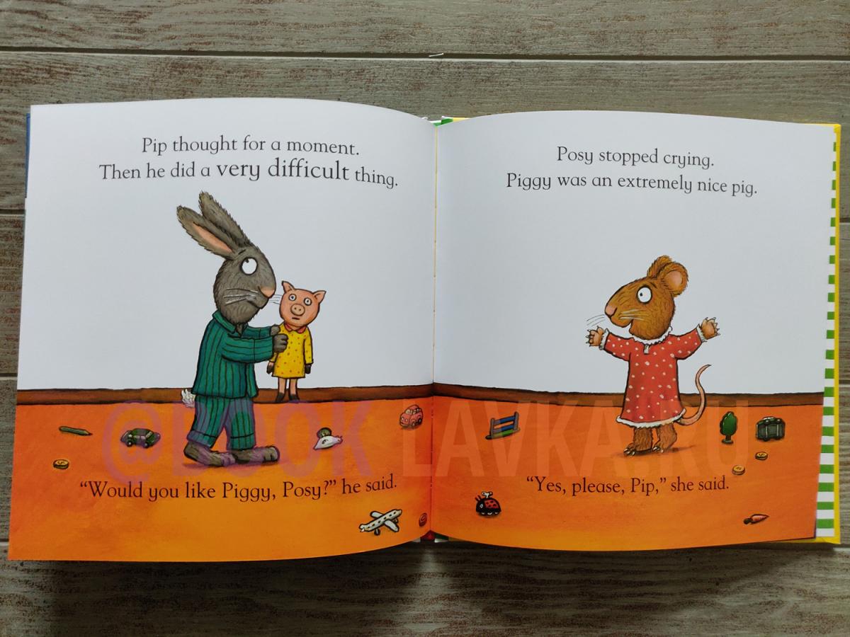 When Posy goes to stay at Pip's house they have lots of fun together before bedtime. But just as they switch out the light, disaster strikes: Posy realises that she has forgotten her favourite frog toy. Keen to help his distraught friend, Pip offers Posy a range of different toys to substitute for her frog, including his own favourite frog money box. But none of them will do: "That's the wrong frog!" Posy wails. It is only when Pip gives Posy his own, very favourite, pig toy that Posy is comforted and the friends can get a good night's sleep, at last.