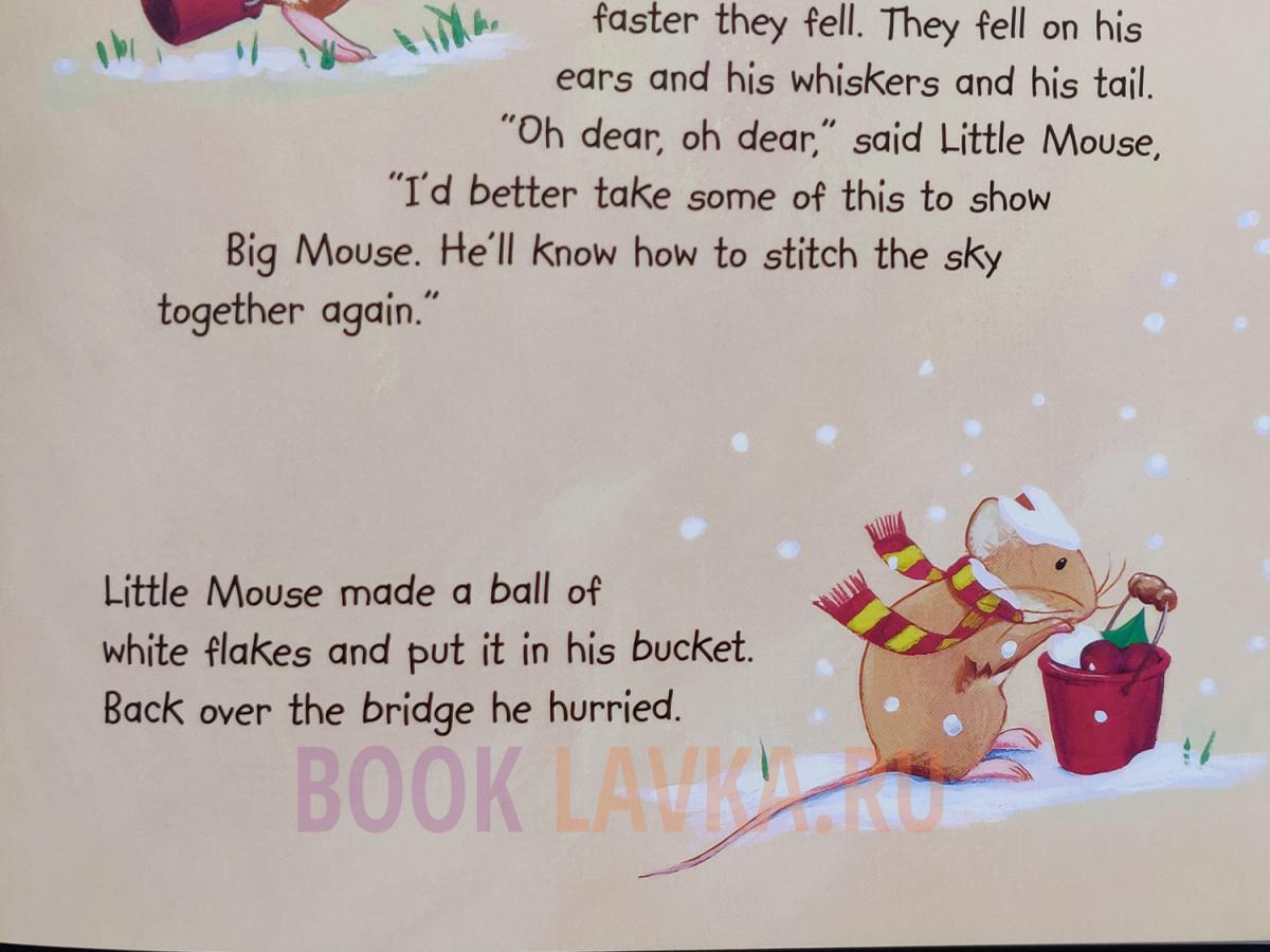 Уютная, тёплая история о мышках, которые готовятся к Рождеству. Пока они украшают дом, Маленькая Мышка выходит на улицу за веточкой падуба – и оказывается в мире, который вдруг превращается в белое, тихое чудо. Снег ложится на всё вокруг, а среди сугробов появляются загадочные формы и предметы, которые нужно рассмотреть и отгадать.