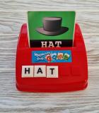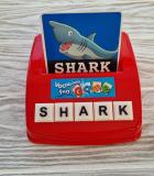 1) вставляете карточки в специальную подставку и не показываете ребенку слово. Он сам вспоминает слово и сам его собирает. Потом открывает заслонку и проверяет себя.