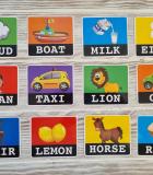 - 30 двусторонних карт со словами (tiger, tea, one, two, five, six, eight, ten, peach, bags, car, fish, plane, ear, cake, nurse, bear, mouse, shark, mouth, horse, man, hat, woman, boy, fan, hand, rice, lion, toys, shirt, goat, taxi, cow, zebra, house, milk, water, jam, girl, pen, snow, chair, pear, lemon, bed, cloud, desk, light, soda, bike, bird, zero, bread, boat, phone, train, star, bus, nos
