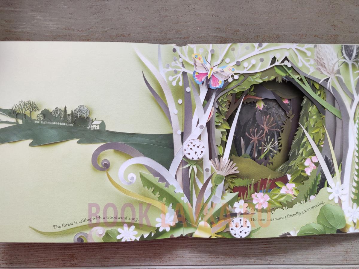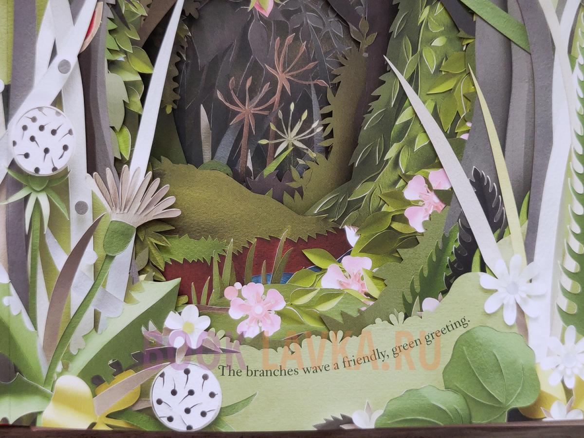 Девочка идёт по лесной тропе, а вокруг оживают цветы, птицы и ветви, будто приветствуя её своим шелестом. С каждым шагом путь становится всё удивительнее, а за каждым поворотом ждёт новое открытие, спрятанное в вырезанных из бумаги чудесах.